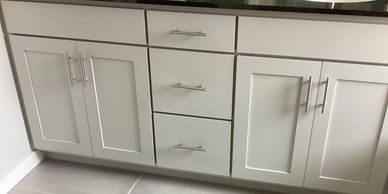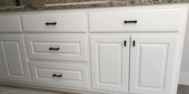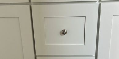 Top drawer front is HDM slab (no frame). Lower, larger drawer fronts are HDM slab (no frame)