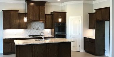 Stained cabinets - available wood species: knotty alder, clear alder or red oak. Semi-gloss sheen. Stained shaker style doors are 5 piece, 2 1/2" frame and have 1/4 veneer panel.